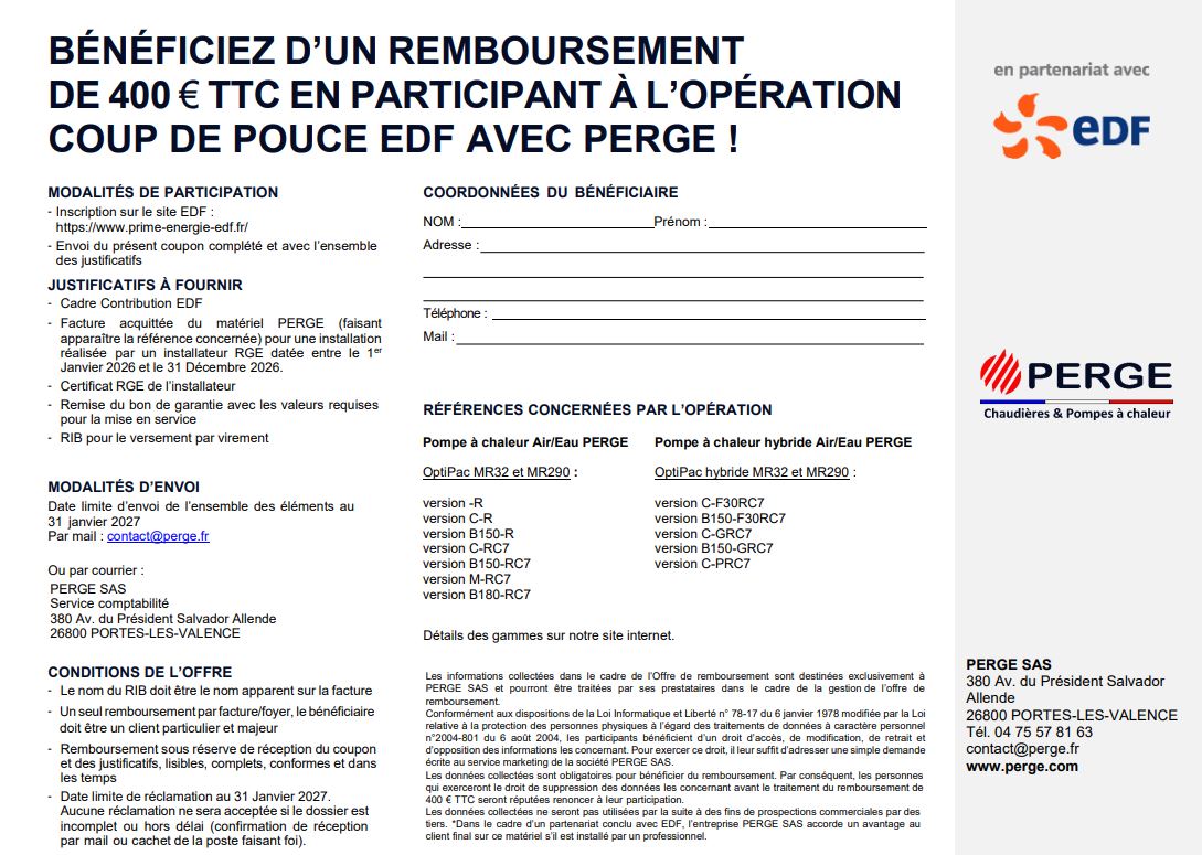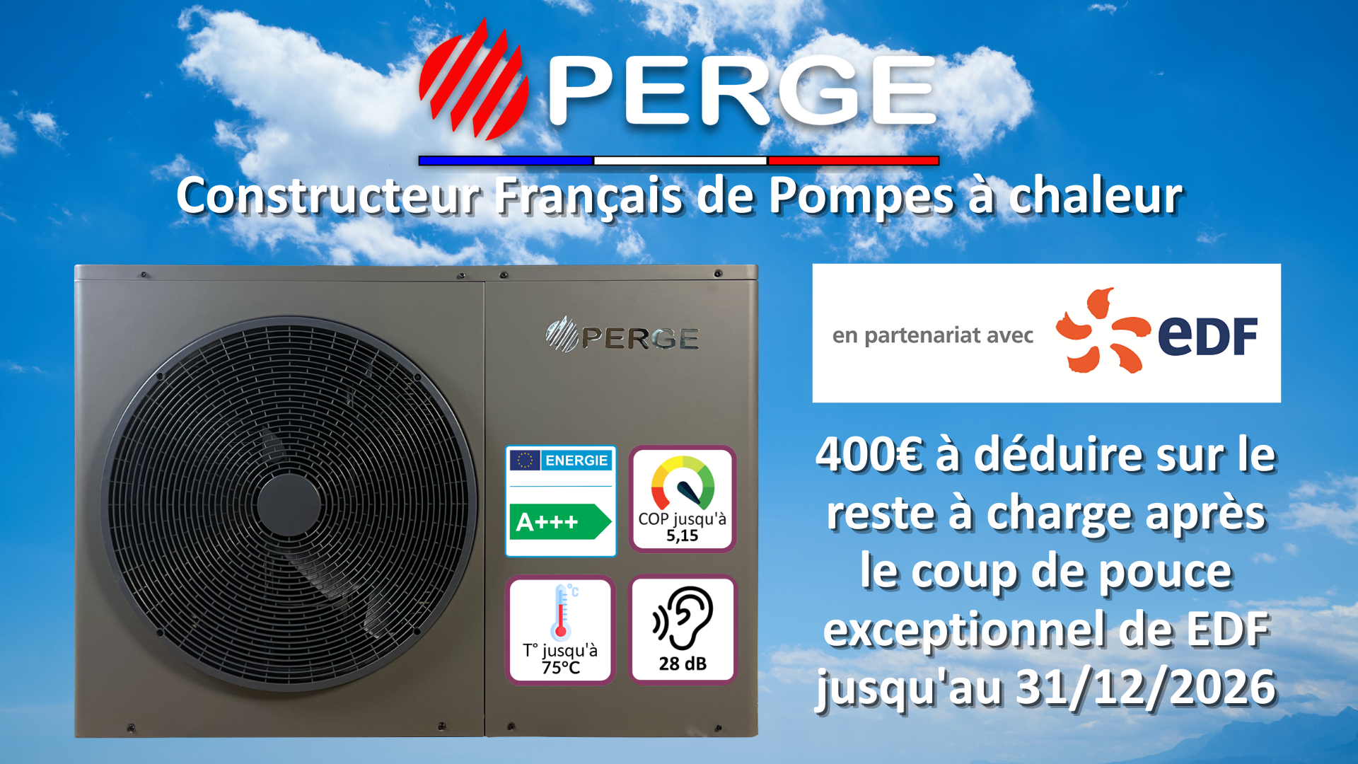 Dans le cadre d'un partenariat conclu avec EDF, l'entreprise PERGE accorde un avantage de 400 € TTC sur ses pompes à chaleur*.