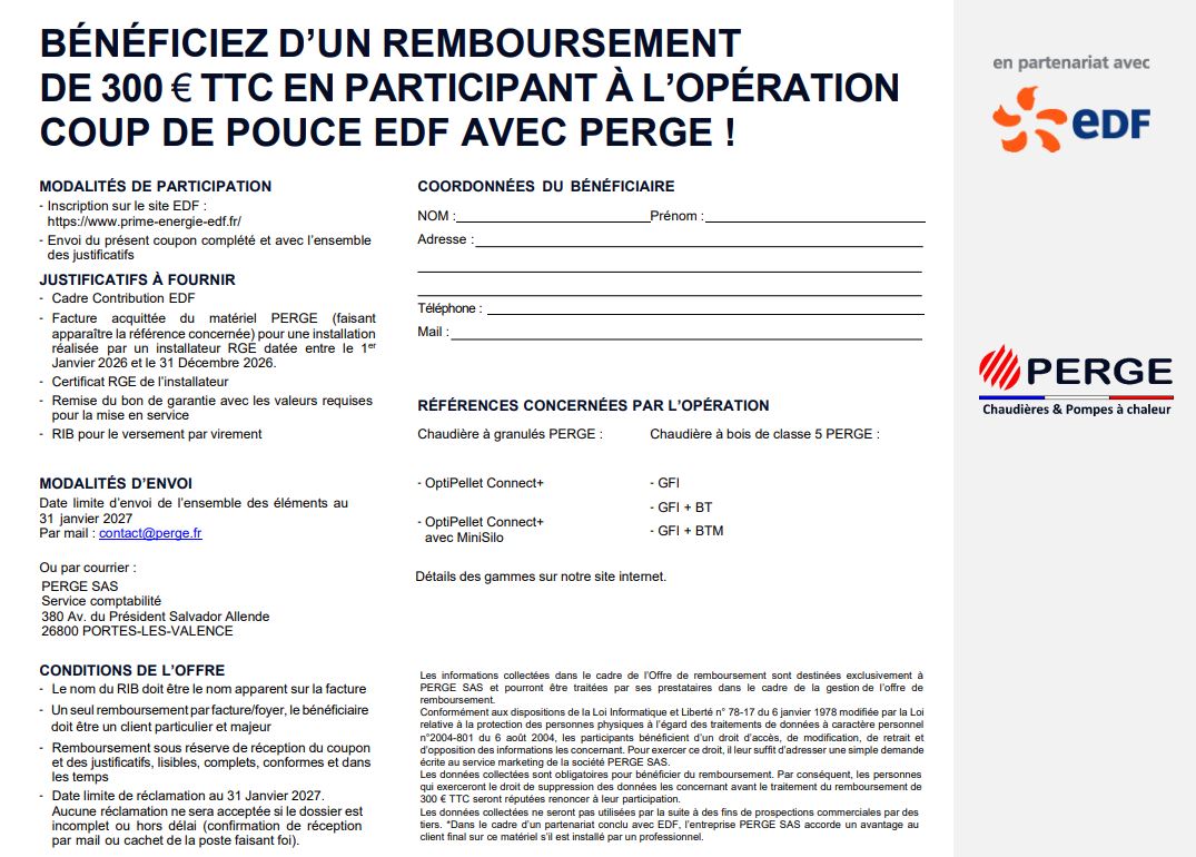 Dans le cadre d'un partenariat conclu avec EDF, l'entreprise PERGE accorde un avantage de 300 € TTC sur ses chaudières biomasse (GFI et OptiPellet)*.