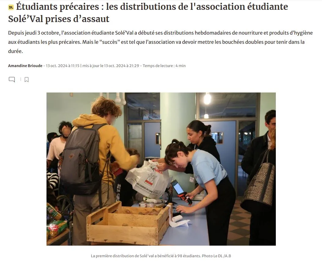 En 2024, PERGE a décidé d'aider les étudiants valentinois en soutenant Solé'val, une association locale, pour faciliter leur accès à des produits alimentaires et d’hygiène essentiels. (Cliquez ici pour voir l'article au complet qui en parle).